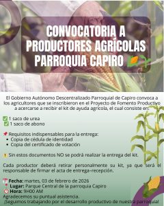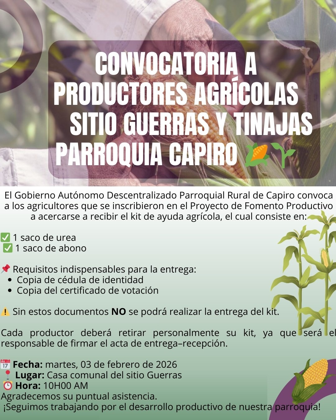 El Gobierno Autónomo Descentralizado Parroquial de Capiro convoca a los agricultores que se inscribieron en el Proyecto de Impulso a la Producción de Maíz en